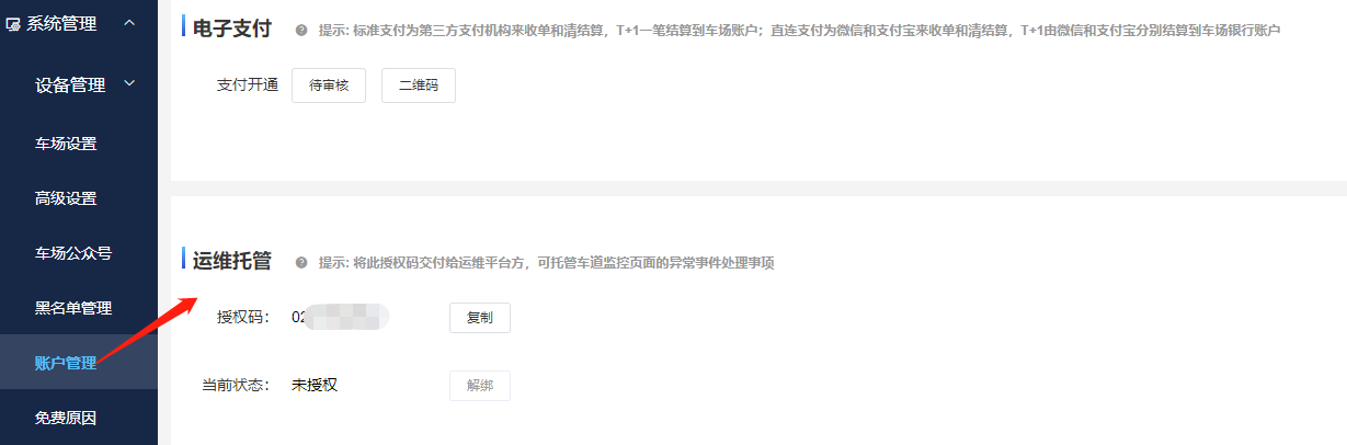 車場登錄云平臺,系統(tǒng)管理模塊的賬戶管理頁面,復(fù)制授權(quán)碼交于運(yùn)維平臺方綁定,即可托管車場異常時(shí)間處理事宜。
