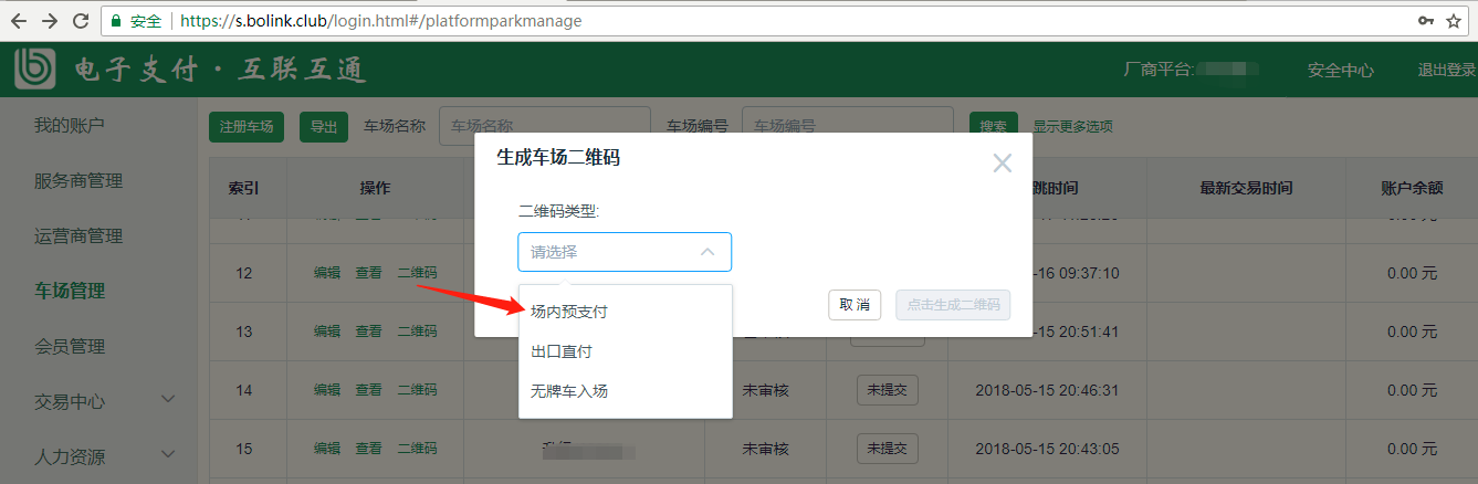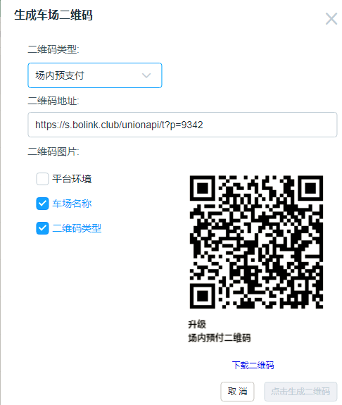 1.1、廠商平臺管理員登錄本廠商的泊鏈后臺,選擇車場管理模塊,在需要生成場內預付碼的車場點擊“生成車場二維碼”,二維碼類型選擇“場內預支付”,即可生成對應二維碼。可勾選該圖片下方的標記項、可下載圖片、可復制二維碼地址。