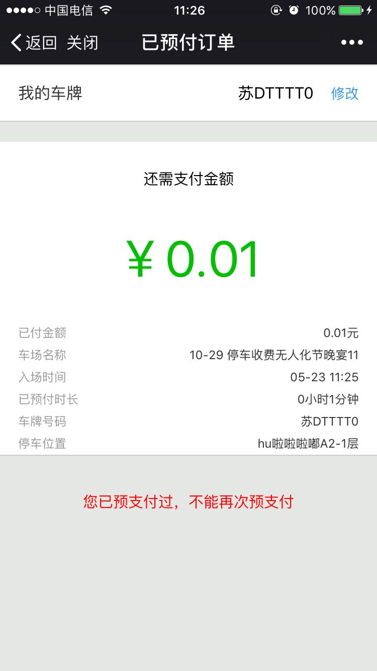 當前泊鏈只支持一次預付,再次掃碼會提示已預付。