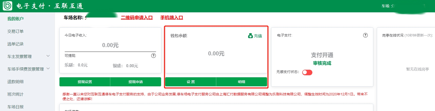 2、錢包余額僅可以用于免密、無感支付退款,紅包找零支出,不能提現且暫不支持關閉,設置錢包預存金額提交后有再次確認頁面,請謹慎操作!錢包設置后第二天生效;錢包的預存金額是由該車場當天的免密、無感支付余額轉入的(并不是每免密、無感支付一筆就轉入錢包一次,而是當天免密、無感支付的余額按照和設置的預存金額對比后統一一筆轉入錢包的)。