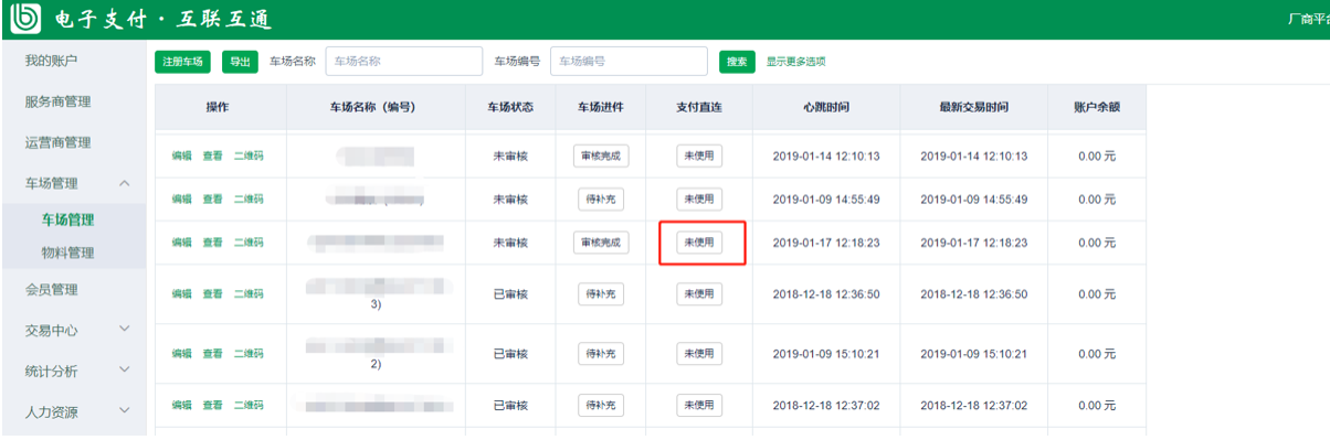 3、車場信息填寫正確,走正常的開通直連流程,車場可以在支付直連入口的“開通狀態(tài)”查看當前進展,如果是開通中的狀態(tài)的時候是不允許編輯修改的。