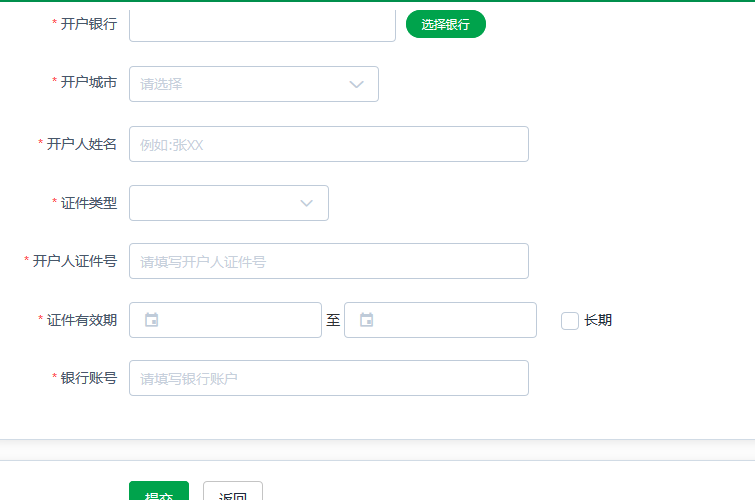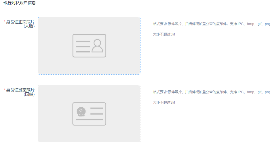 注意:銀行對私賬戶信息 這里上傳的身份證照片和填寫的開戶銀行,開戶城市,開戶人姓名,開戶人證件號和銀行賬號的信息一定要一致。