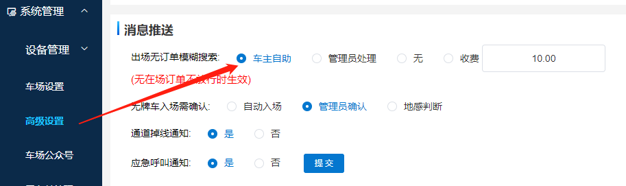 當車場設置出口無訂單不放行時,可在高級設置里打開“車場自助”,之后車主可以在未匹配到訂單時,按提示掃碼輸入自己車牌進行主動搜索相似訂單,這樣處理出、入場識別有差的情況。