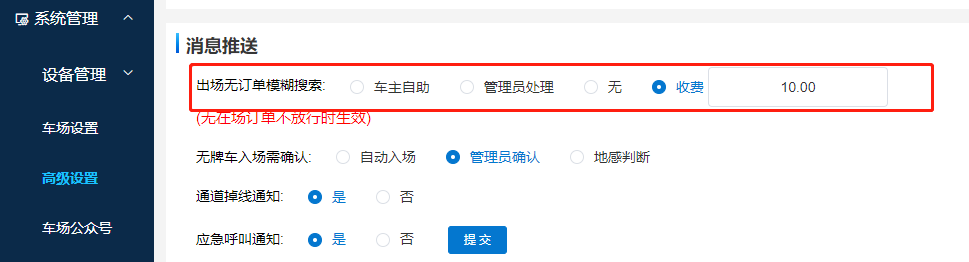 當車場設置出口無訂單不放行時,可在高級設置里打開“收費”功能,并設置收費金額(支持 兩位 小數),這樣出口未匹配到在場訂單時會提示車主掃通道碼支付,返回給車主一個無牌車的訂單,以及設置的該金額,支付后會放行。