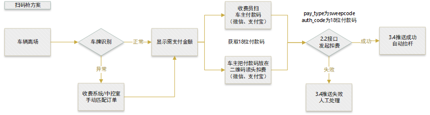 3、車主掃碼支付:車輛開到出口,車主用微信或者支付寶掃碼顯示出自己當前停車費用,如果車牌匹配失敗會顯示出多個車牌讓中控室人員確認訂單,支付成功后調用3.4推送給收費系統抬桿。