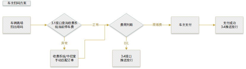 1、已預付車輛離場:車主在出場前掃描場內預付碼進行訂單預支付,支付成功后到出場結算時,本地收費系統判斷是否還需補繳費用,如無需繳費會自動放行,如需繳費車主支付完對應費用,泊鏈通知車場放行。