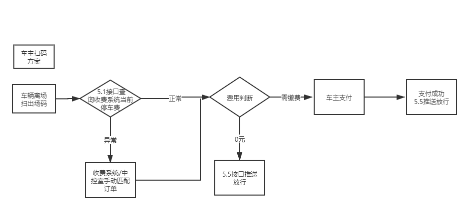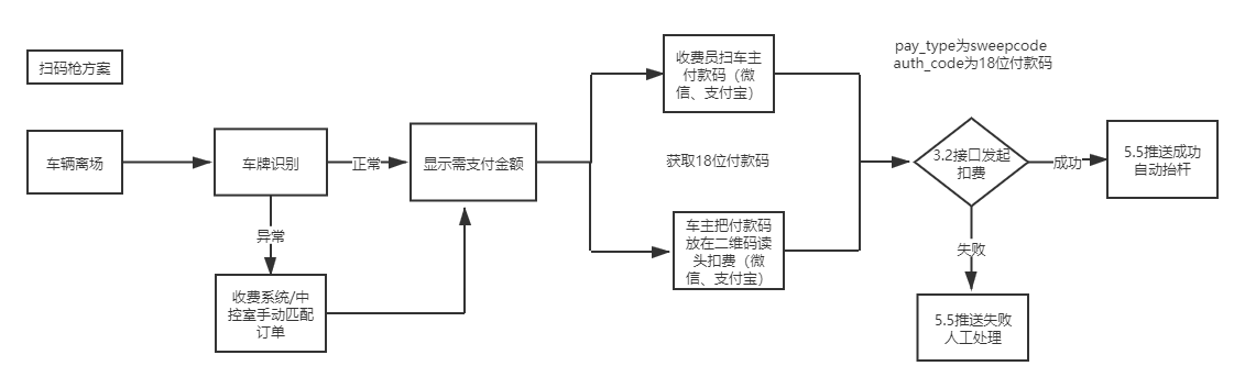 3、車主掃碼支付:車輛開到出口,車主用微信或者支付寶掃碼顯示出自己當前停車費用,如果車牌匹配失敗會顯示出多個車牌讓中控室人員確認訂單,支付成功后調用5.5推送給收費系統抬桿。