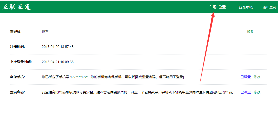 如果想修改登錄人員名字,請點擊安全中心,這個頁面同時可以修改密碼、密保手機等信息