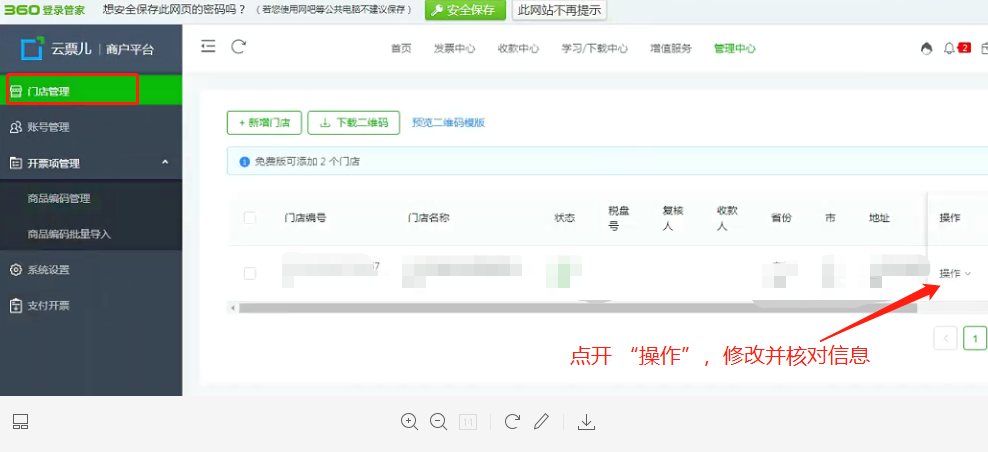 左側(cè)門店管理菜單,點擊后右側(cè)點編輯,可以修改開票人信息。![]