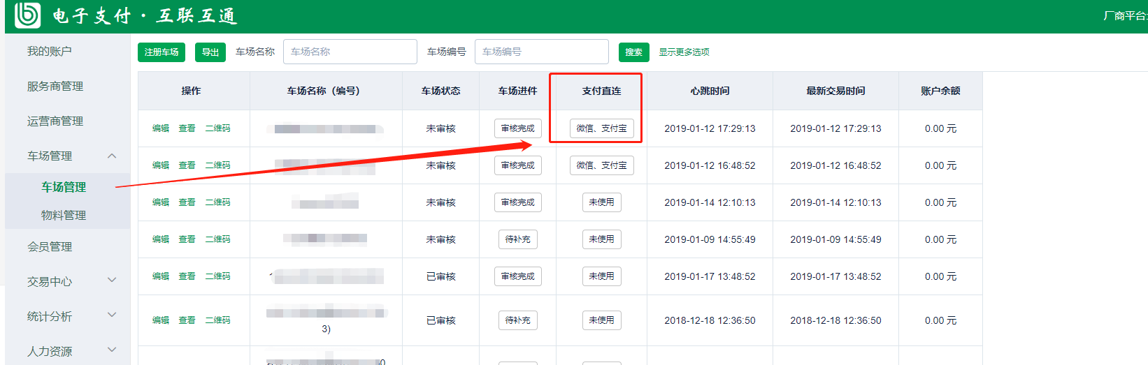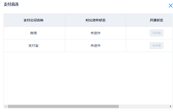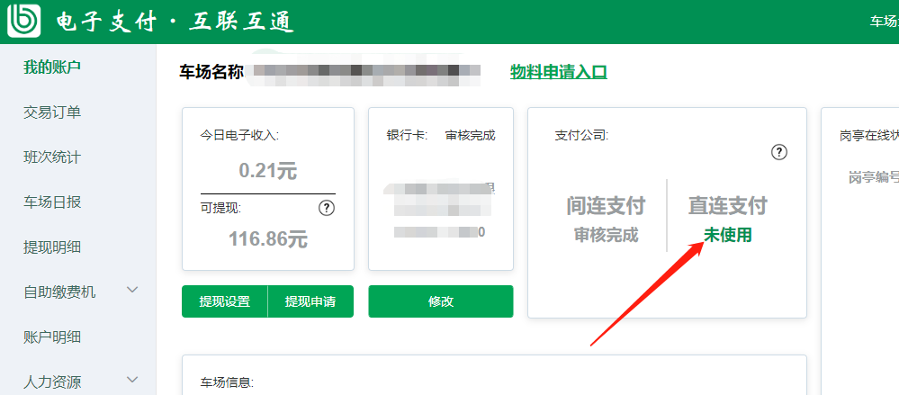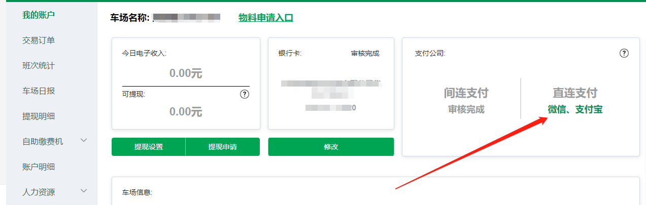 4、車場信息填寫正確,走正常的開通直連流程,車場可以在支付直連入口的“開通狀態(tài)”查看當前進展。