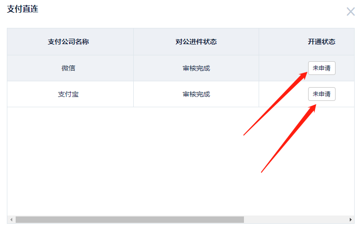 1、登錄后臺可以點擊直連支付的狀態(tài)“未使用”,進行下一步的申請操作。