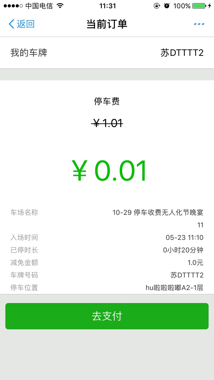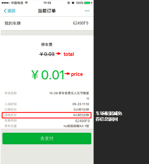 上圖所示,綠色數(shù)值為當(dāng)前應(yīng)收金額,是減免之后還需支付的金額,車主可當(dāng)前預(yù)付也可出場時支付。