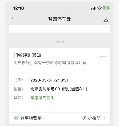 在綁定員工微信時,需關注“智慧停車云”公眾號,之后的消息會在這個公眾號里推送該員工。點擊該消息跳轉至“云車場管家”小程序可免登陸接聽該呼叫。