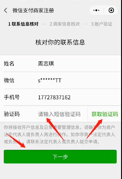 3:確認信息,點擊“獲取驗證碼”,接受短信驗證碼后填入短信驗證碼,點擊“下一步”