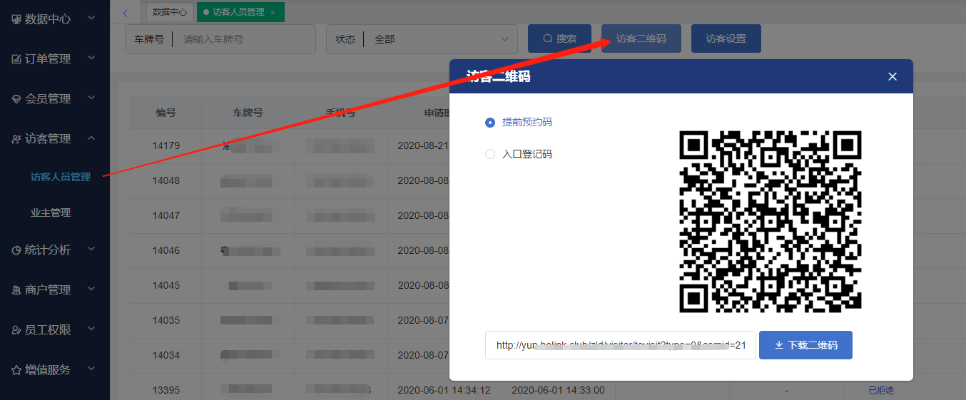 車場管理員登錄云平臺,在“訪客管理”模塊的“訪客人員管理”頁面,可生成訪客二維碼??梢韵螺d打印該二維碼貼在來訪人員需要掃碼的位置,也可以將該二維碼地址鏈接置于私有公眾號內,供車主點擊后訪問。